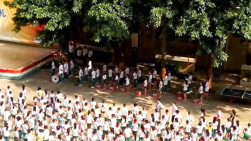 Pierwszy dzień w pracy minął spokojnie, nie licząc 40-osobowych klas, bijących się chłopców, płaczu za mamą i jednego spryciarza, który wsadził sobie coś do oka i trzeba było go ratować. Drugiego dnia natomiast od rana szykowało się COŚ! Zaczęło się od szkolnych wojaków, formujących się na placu (nie jesteśmy pewne, czy są oni z jakiejś specjalnej klasy wojskowej czy może z młodych pionierów). Maszerowali raźno i pokrzykiwali bojowo.
